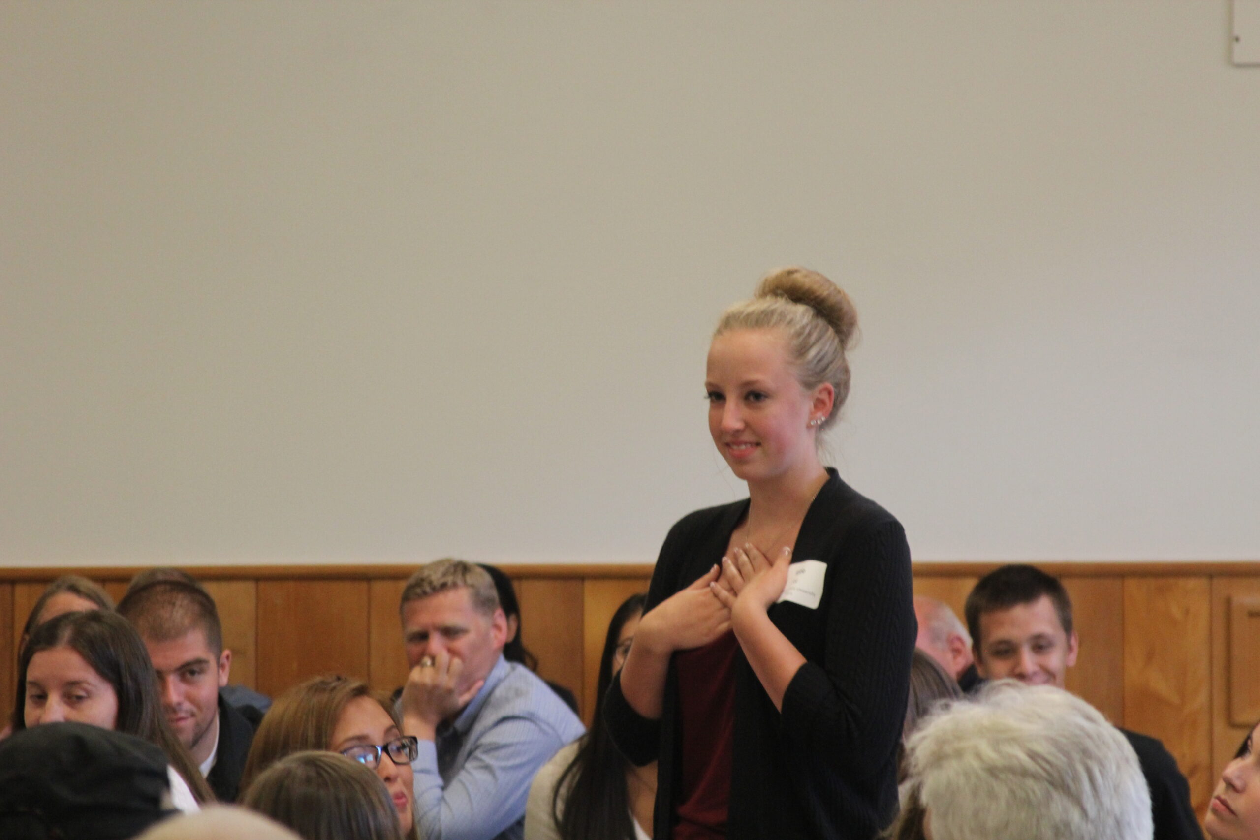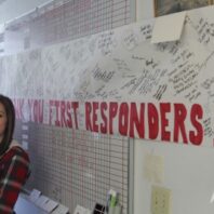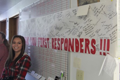 Intern Liz Norris in front of a banner signed by locals thanking the 530 Slide First Responders – Credit: Sylvia Kantor