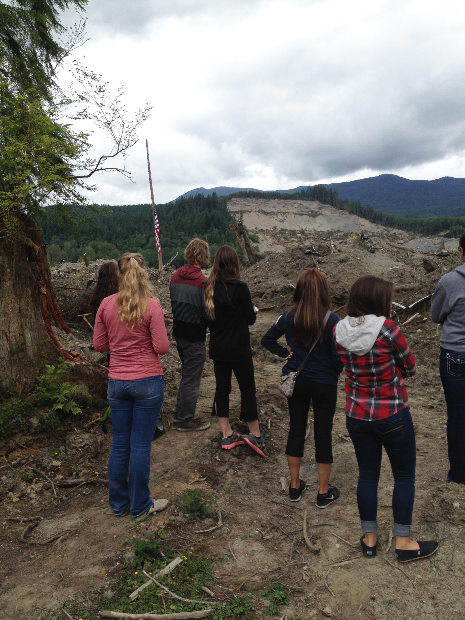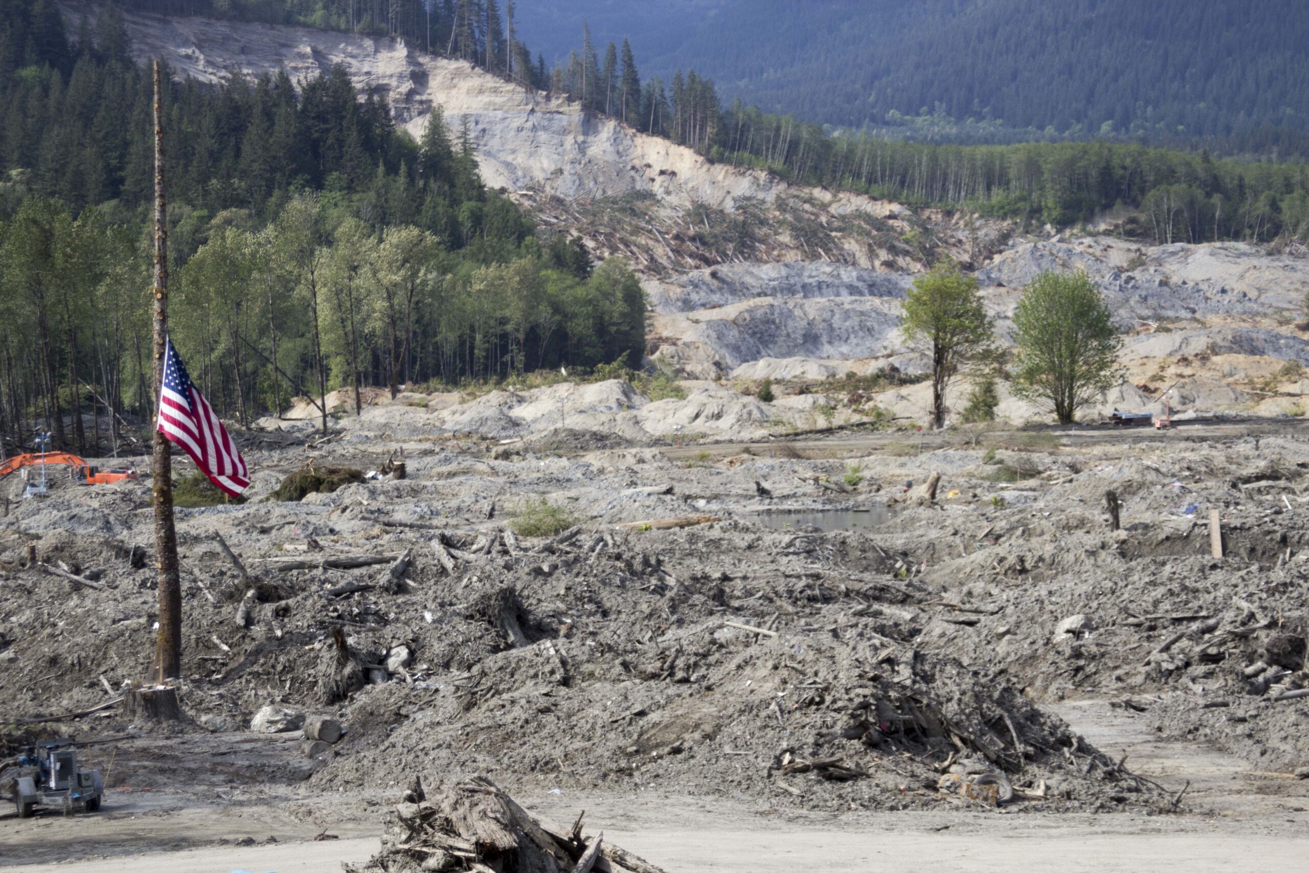 An American flag lowered to half-mast in front of the site of the 530 Mudslide – Credit: Sylvia Kantor