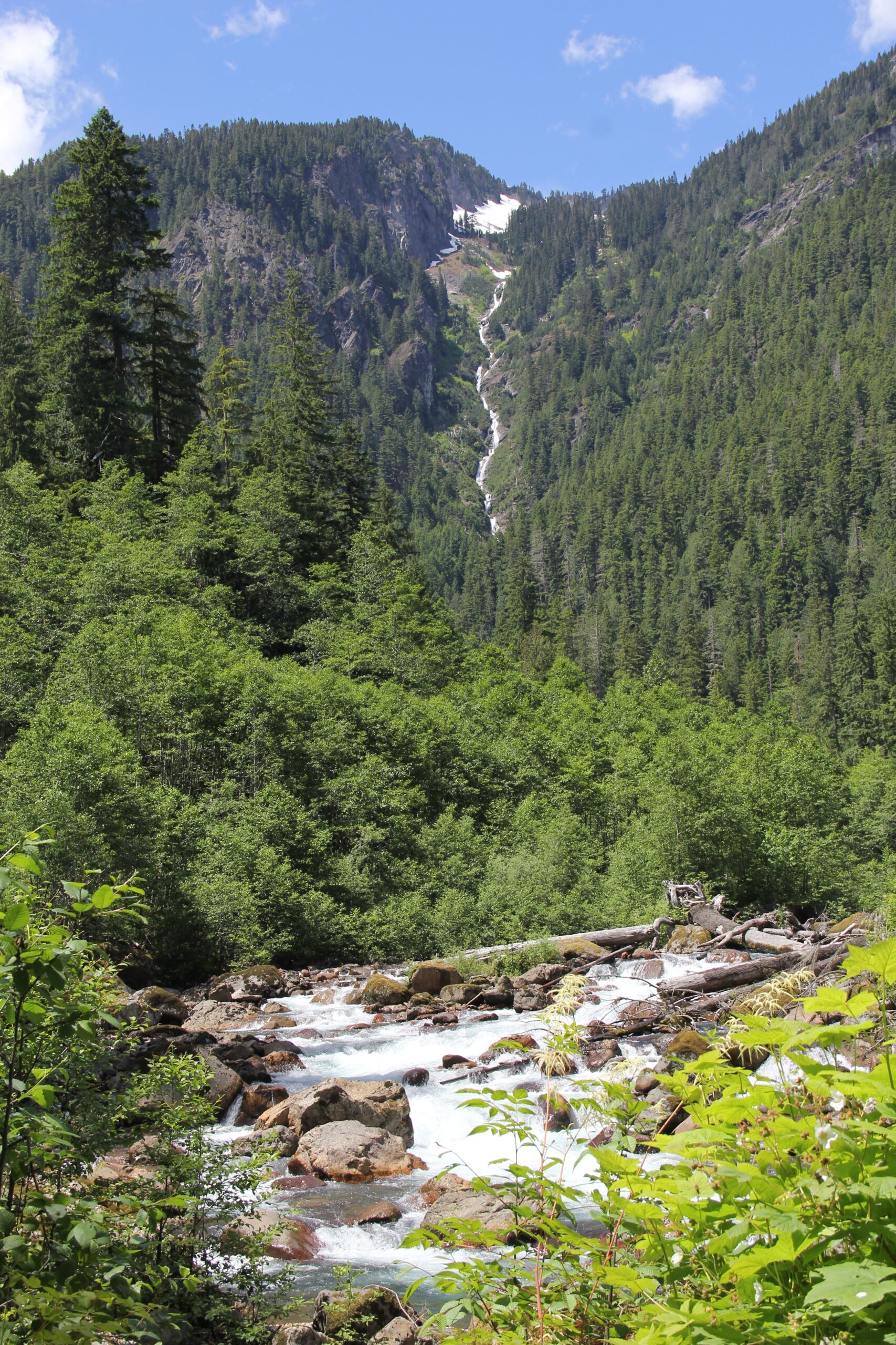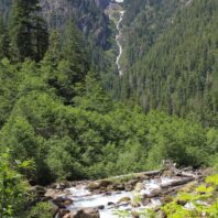 A view of a waterfall on a hill above the Sauk River visible from Mountain Loop Highway – Credit: Tesia Lingenfelter