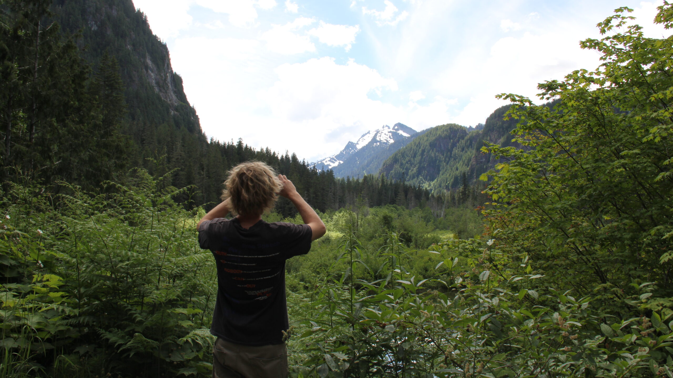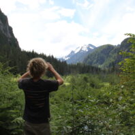 Intern Carson Davis taking a photo of the scenery along Mountain Loop Highway – Credit: Tesia LIngenfelter